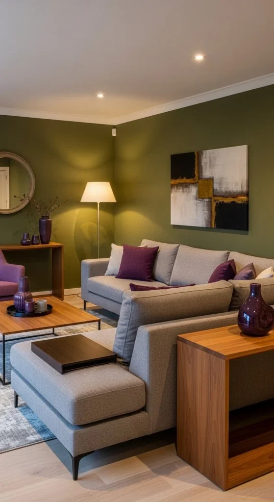 Olive and plum create an unexpected pairing that feels rich but controlled. Use plum in small accents. Cushions, art, or a throw work well. Earthy greens stay dominant to keep balance. Avoid bright purples. Muted tones look more refined. DIY tip: add plum through removable decor for flexibility. Keep rugs neutral. Wood tones should stay warm and simple.