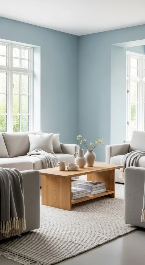 Sea Salt blue feels light without turning cold. It works best when paired with warm neutrals. Beige sofas and cream rugs soften the blue tone. Light reflective color keeps the room open and calm. Avoid pairing with stark white trim. Soft ivory looks better. DIY tip: paint only the upper half of walls for a subtle color wash. Texture matters here. Add woven baskets or boucle cushions. This scheme works well in rooms with limited natural light.