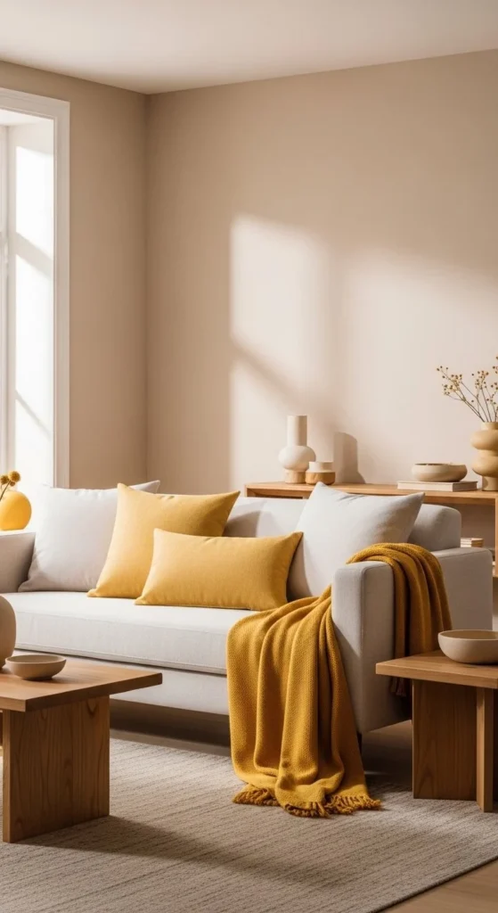 Butter yellow adds cheer without overpowering the room. Use it as an accent only. Cushions, art, or small decor work well. Pair with warm neutral walls for balance. Avoid pairing with cool gray. DIY option: paint a small side table yellow for a subtle color hit. Keep patterns minimal. This palette feels welcoming and easy to live with.