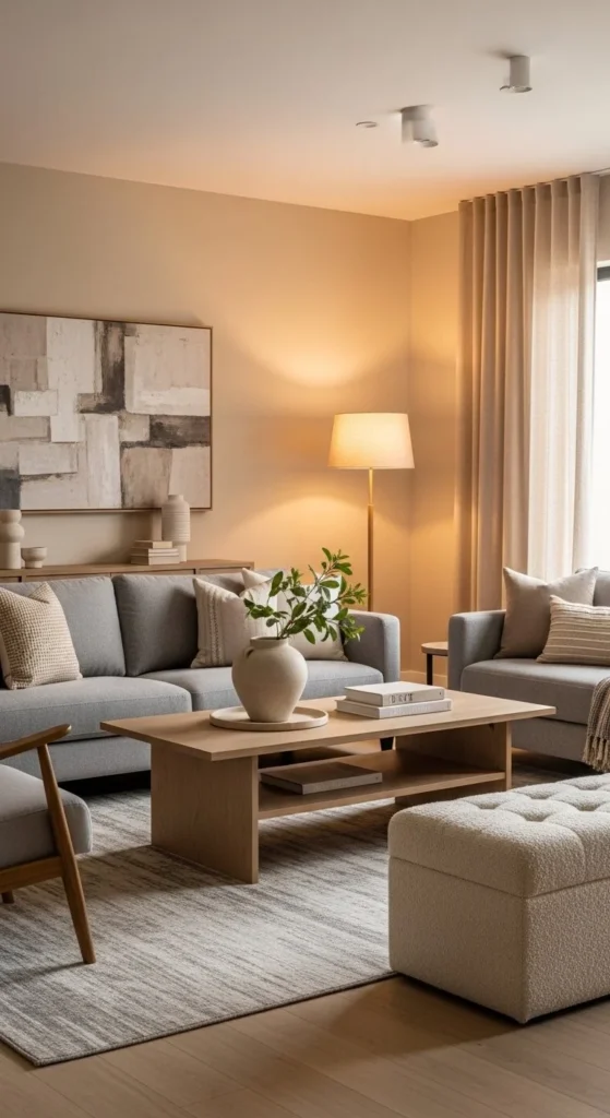 Warm beige and soft gray work well together when neither goes too cool. Beige sets the tone. Gray adds structure. Keep contrast gentle rather than sharp. Choose gray fabrics with warm undertones. Avoid blue gray shades. DIY tip: layer throws in slightly darker beige to blend the two tones. Wood accents should stay light. This palette feels calm and works well in open layouts.