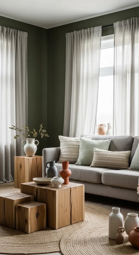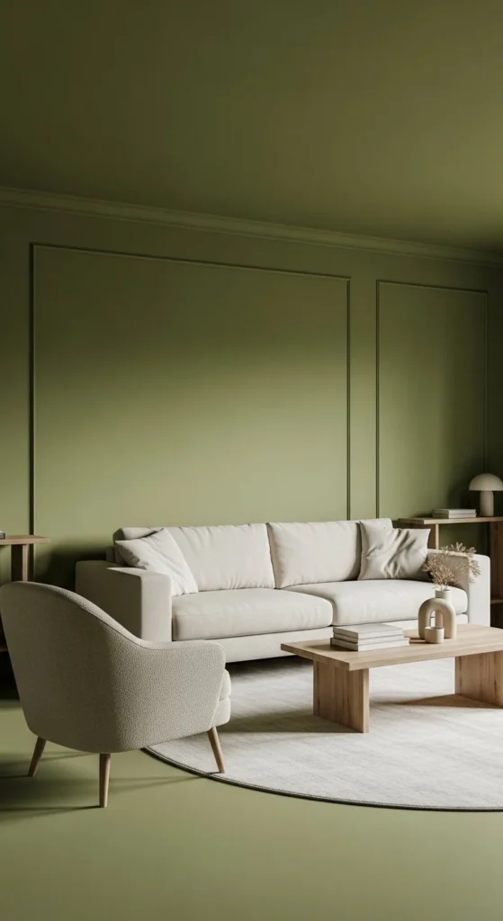 Olive green brings the outdoors in. It feels grounding without feeling dark. Pair it with natural wood layers for warmth. Think coffee tables, shelves, or ceiling beams. Avoid glossy finishes. Matte paint looks better with green. For small budgets, add olive through paint and keep furniture neutral. Swap throw pillows seasonally for variety. Linen curtains work better than heavy drapes here. This scheme handles seasonal decor well. Add clay, stone, or ceramic accents for texture. Keep metals muted. Black works better than gold in this setup.