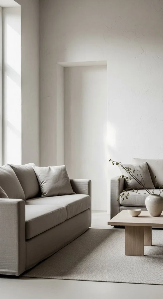 Plaster white brings warmth that flat white lacks. The texture adds depth without color. Pair it with natural linen upholstery for a relaxed feel. Avoid sharp contrast. Everything should feel soft and tonal. DIY option: textured paint or limewash achieves a similar look. Keep decor minimal. One statement piece works better than many small items. This palette works well in bright rooms.