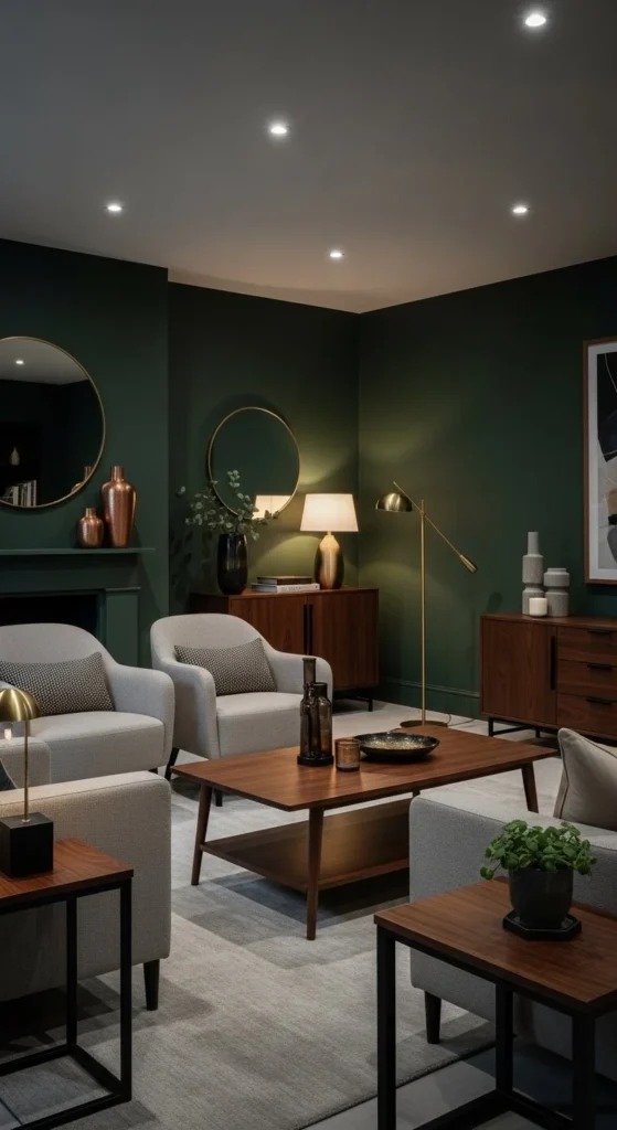 Forest green feels rich and enveloping. Balance it with warm metallic accents like aged brass. Use metallics sparingly. Lamps or trays are enough. Dark green walls work best in rooms with controlled lighting. DIY tip: add green through paint and keep furniture light to avoid heaviness. Rugs should stay neutral. This scheme feels dramatic yet livable.