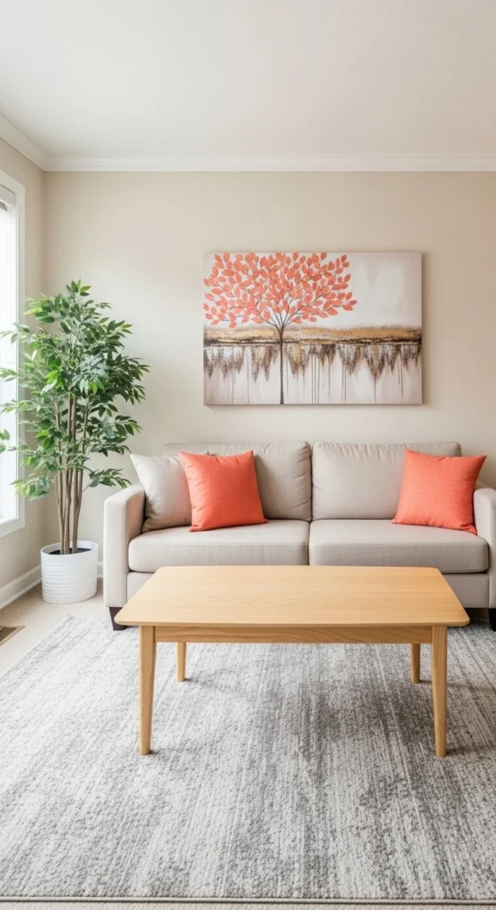 Coral adds warmth without taking over the room. Use it in small accents only. Cushions or art work best. Pair it with soft neutral bases like beige or warm white. Avoid mixing coral with strong patterns. DIY option: paint a small decor item coral for a subtle update. This palette feels playful but controlled.