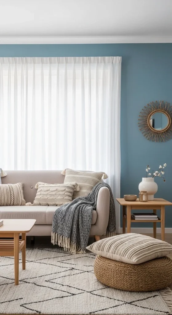 Soft blue brings calm without cooling the room too much. It pairs well with linen and oak. Stick to light, natural textures to keep the space open. Avoid heavy drapery. Sheer curtains work best. DIY option: add blue through paint and keep furniture neutral. This palette works especially well in warm climates where cooler tones feel refreshing.