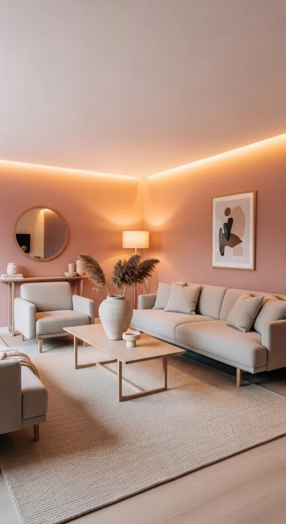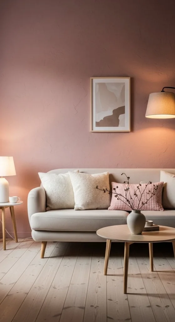 Dusky pink reads more neutral than sweet. It adds warmth without feeling playful. Plaster style finishes give depth and softness. Pair with muddy neutrals like beige or stone. Avoid bright whites here. DIY option: limewash style paint adds texture without wallpaper costs. Keep furniture low and simple. Curved silhouettes work well with pink tones. Use black accents sparingly for contrast. This palette works well in low light rooms because it reflects warmth. Art should stay minimal. One large piece beats many small frames.