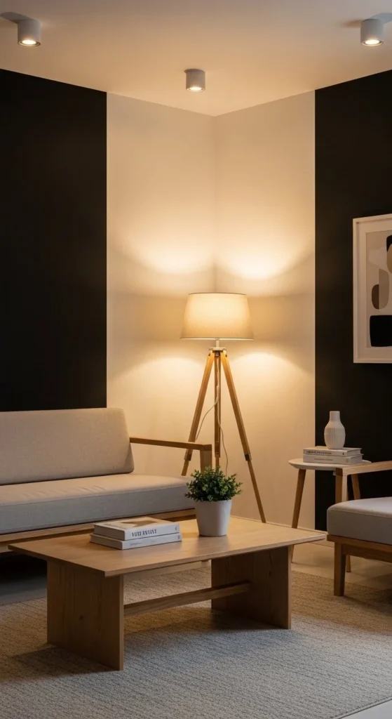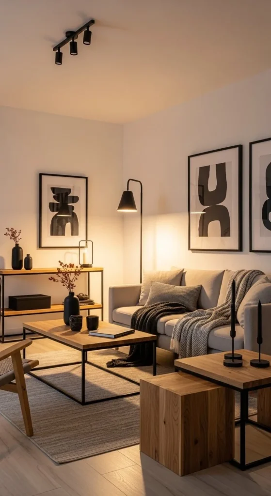 Black and white feel strong when softened with wood. Use white as the main color. Black works best in accents only. Furniture legs, lighting, or frames are enough. Wood balance keeps the room from feeling stark. DIY tip: add wood through trays or shelves if furniture feels too bold. Keep fabrics soft and matte. This scheme suits modern homes with clean lines.