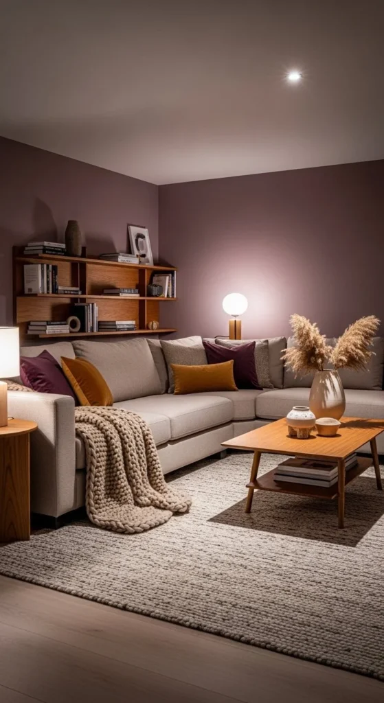 Plum brings richness without overwhelming when used carefully. Pair it with beige to keep the room grounded. Avoid pairing with cool gray. Saturated jewel hues work best in rooms used during evenings. DIY tip: use plum on one feature wall if unsure. Add texture through rugs and cushions rather than more color. This palette feels bold yet controlled and finishes the list with drama.