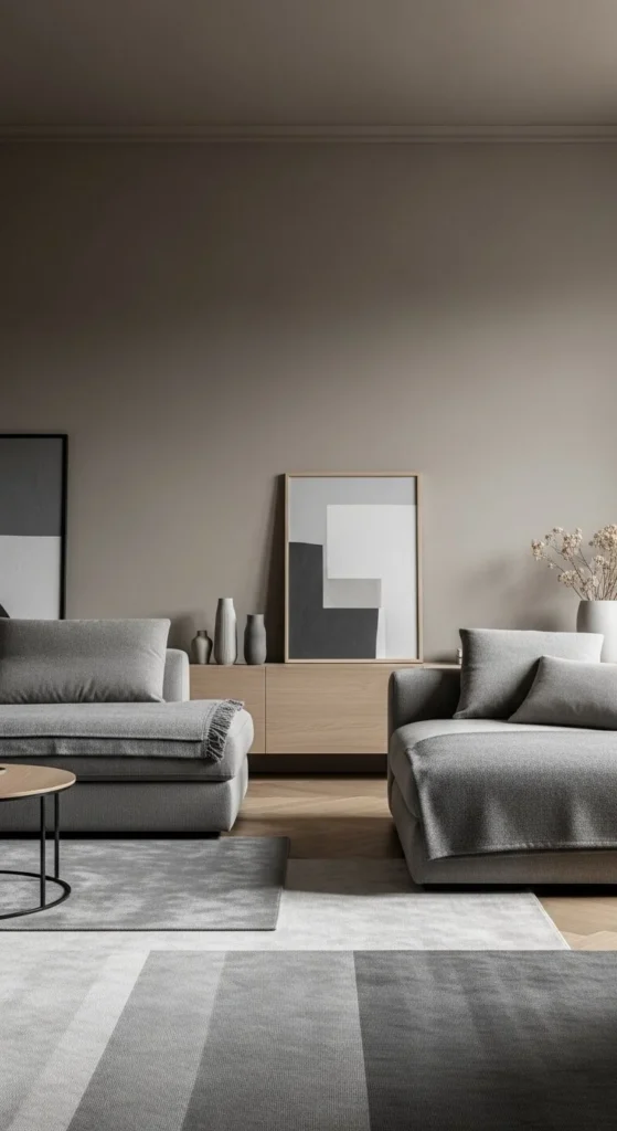 Warm gray avoids the cold feel of old school gray. The key here is texture. Mix boucle, wool, and woven fabrics to avoid flatness. Use tonal layering instead of contrast colors. Dark gray throws add depth. Light gray walls keep the room open. DIY trick: swap pillow covers seasonally to refresh the look. Stick to matte finishes. Glossy paint breaks the softness. Wood accents should lean warm, not ashy. This scheme works well for renters since it relies more on styling than paint alone.