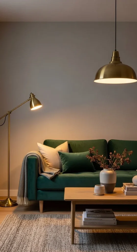 Emerald green brings richness without overpowering the room. Use it as an accent rather than a wall color. A sofa or armchair works best. Pair it with soft neutral walls to let the color stand out. Brass details add warmth and polish. Budget tip: velvet look fabrics give the same effect at a lower price. Keep rugs simple and light. Too much pattern fights the jewel tone. Add greenery for balance. This scheme feels bold yet controlled.