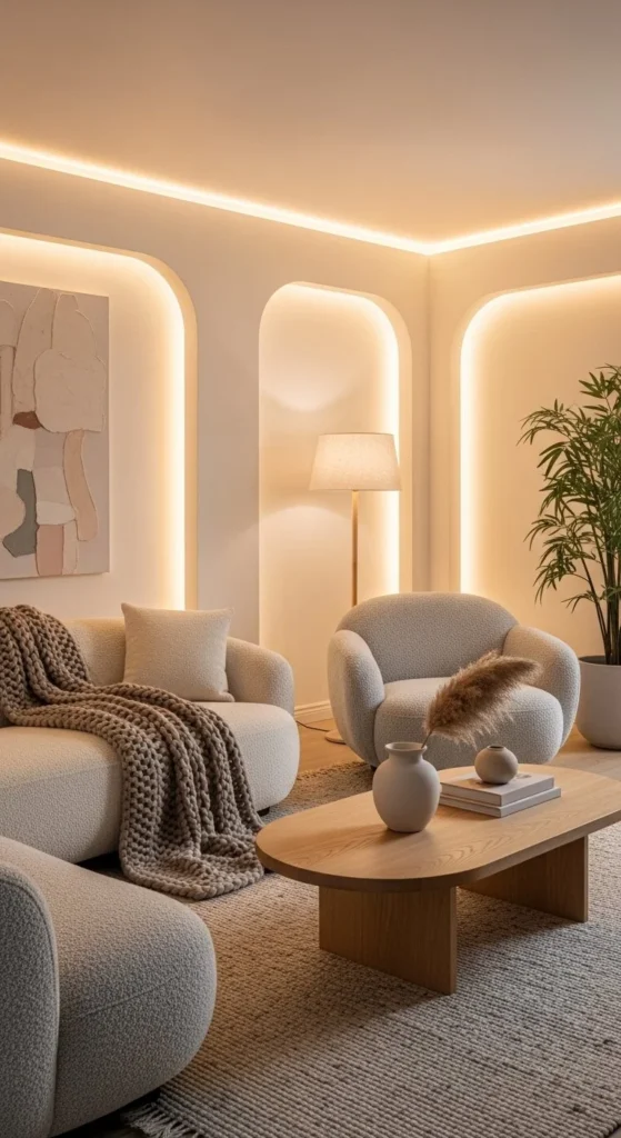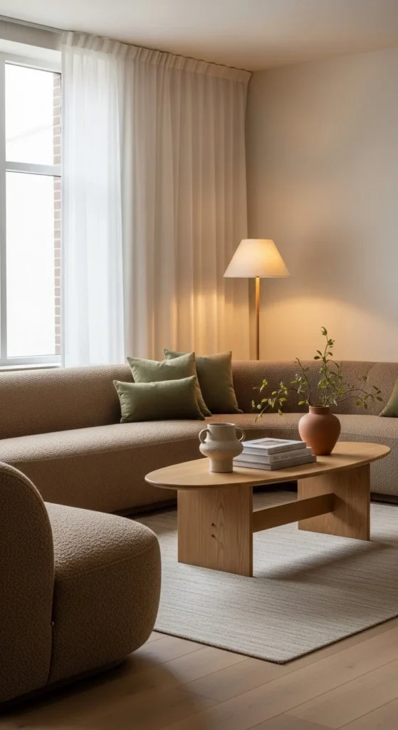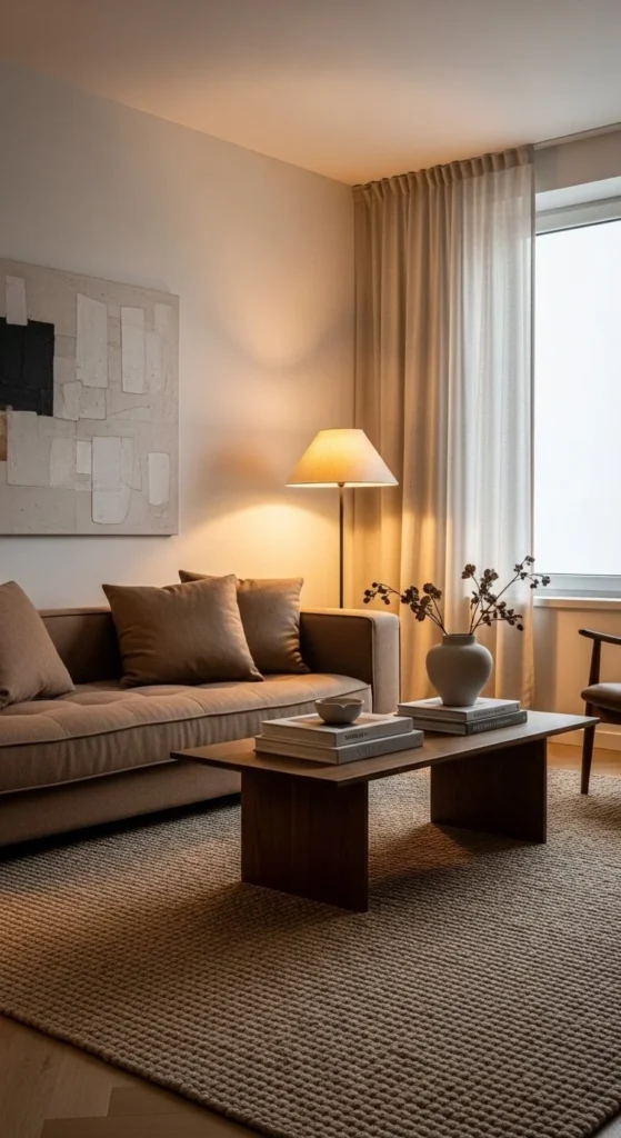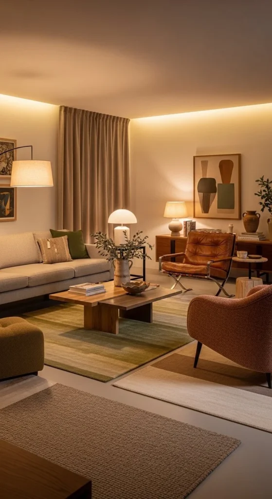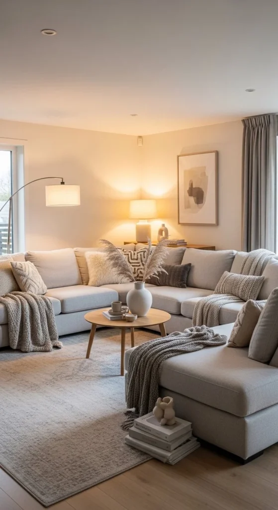 Choose fabrics with texture. Bouclé, chenille, brushed cotton. Budget option: add textured slipcovers instead of new furniture. Keep tables within easy reach. Avoid sharp edges. Lighting should glow, not glare. This layout works well in homes focused on relaxation and downtime.