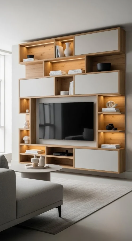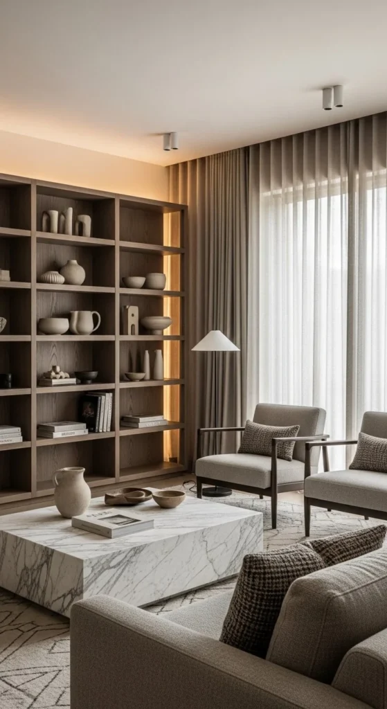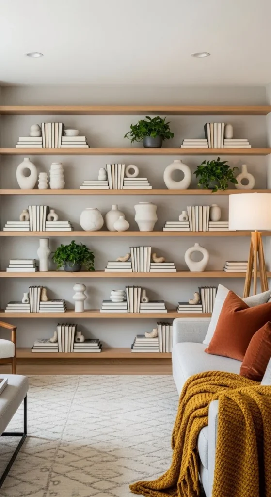 Group objects by tone, not size. Leave breathing room between clusters. DIY tip: style shelves from the floor up, not randomly. Use lighting inside shelves to add depth. Furniture stays simple so shelves remain the focus. This layout works for collectors who want control, not chaos.