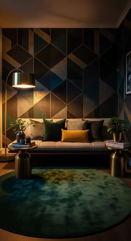 Choose one dominant pattern. Everything else stays quiet. Low seating prevents visual overload. DIY tip: removable wallpaper offers flexibility without long term risk. Use matching tones across pattern and upholstery for cohesion. Lighting should be layered and dimmable. Skip overhead glare. This layout works well for apartments or secondary lounges.