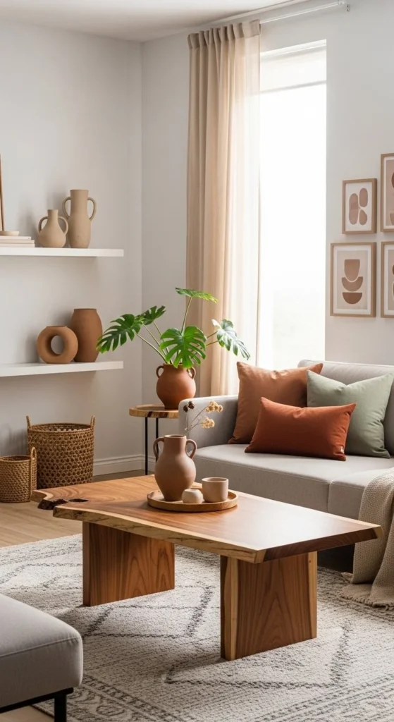 Pair organic tables with simple sofas. Let the table stand out. Budget idea: sand and seal a live edge slab or thrifted wood table. Keep enough clearance for legs and walkways. Use rounded accessories nearby to echo the shape. This layout suits homes where sharp corners feel too formal.