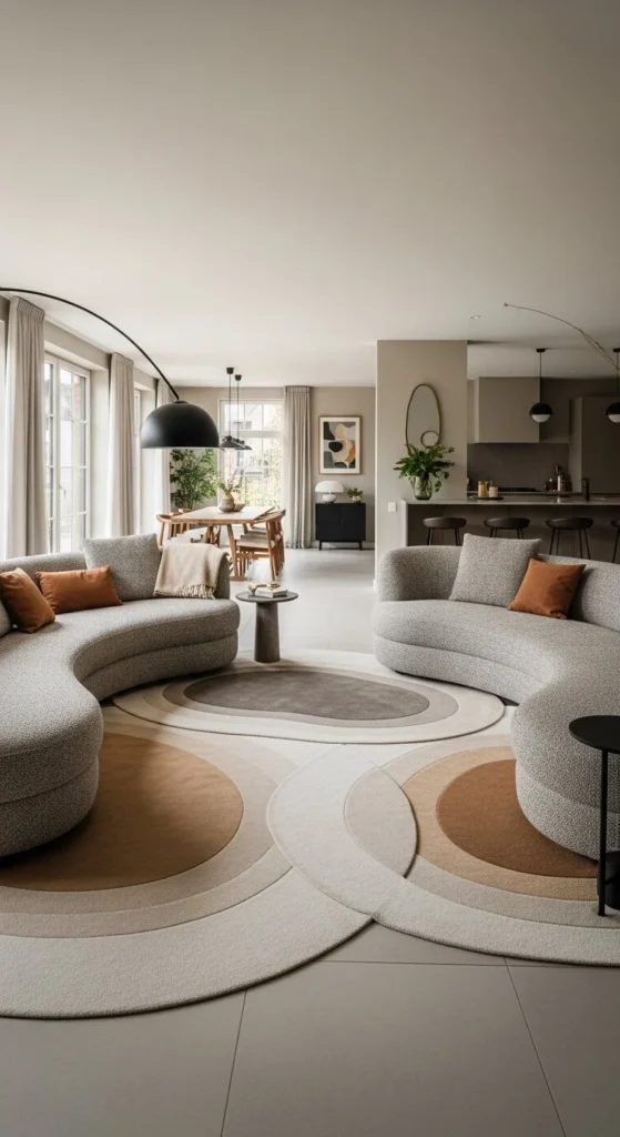 Avoid straight rugs. Choose oval or round. Budget option: layer two smaller curved rugs. Keep accessories minimal. Let shape lead. This layout works well where living rooms blend into dining or kitchen areas.