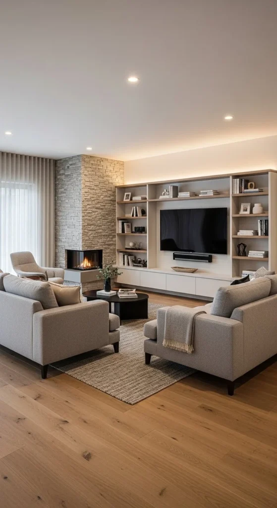 Built ins calm visual chaos. They absorb screens into architecture. Arrange seating directly opposite, keeping walkways wide on both sides. This layout simplifies decisions. Everything has a place.