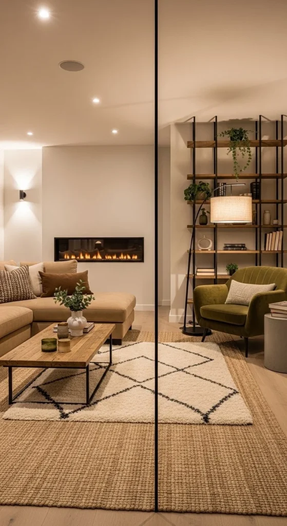 The main seating stays central. Secondary zones sit near windows or corners. Use a chair and lamp combo for reading. A small bar cart can mark another area. DIY tip: layer rugs instead of buying large custom sizes. Keep pathways wide and obvious. This layout works especially well for entertaining and shared homes.
