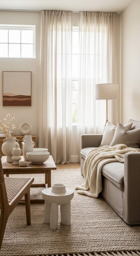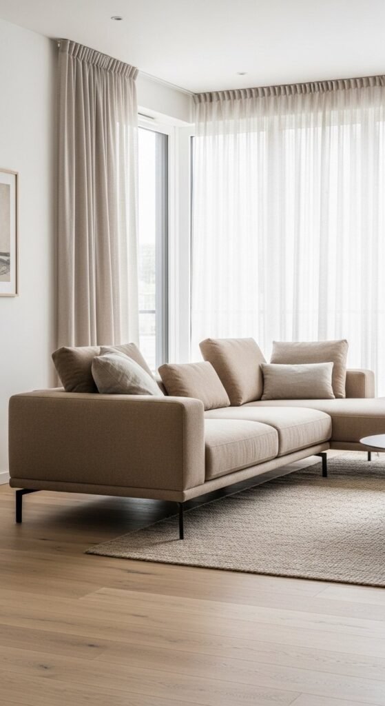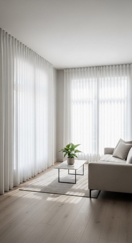 Sheer curtains allow light to filter in while keeping privacy. They soften windows without blocking views. White or warm ivory works best with neutral rooms. Hang curtains from ceiling height to make the room feel taller.