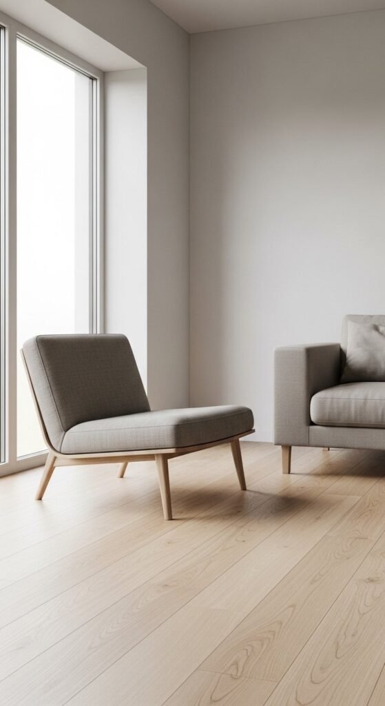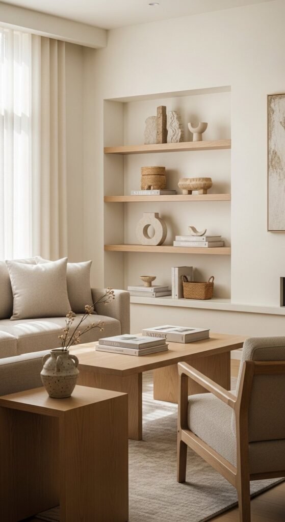 The key is restraint. Too much wood feels busy. When paired with neutral fabrics, light wood adds quiet depth and supports a relaxed atmosphere.