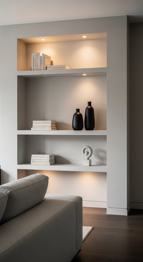 Recessed shelving keeps storage subtle. When shelves sit flush with the wall, they don’t interrupt clean lines. Paint them the same colour as the walls to reduce contrast. This makes decor appear lighter.