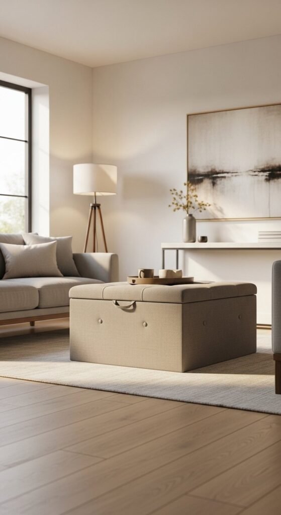 Use ottomans to store throws, books, or remotes. This keeps surfaces clear. In small rooms, an ottoman can replace a coffee table. Add a simple tray when needed.