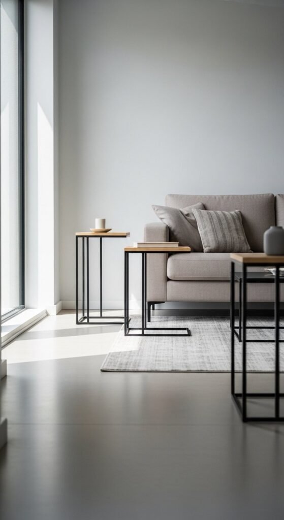 Side tables should stay visually light. Choose slim legs and simple tops. Round shapes soften clean lines and improve flow.