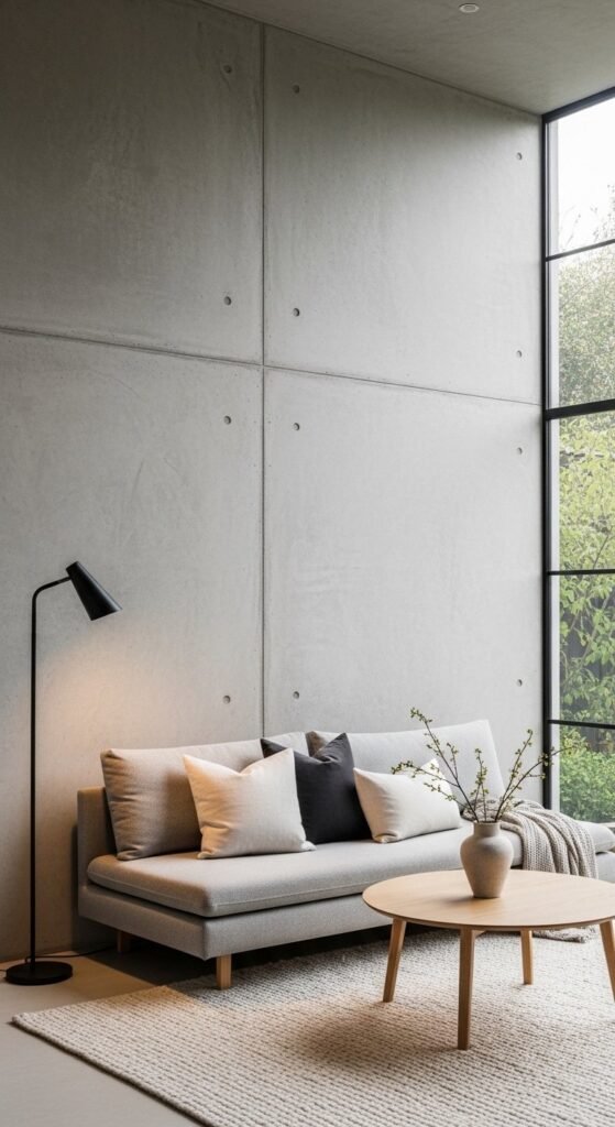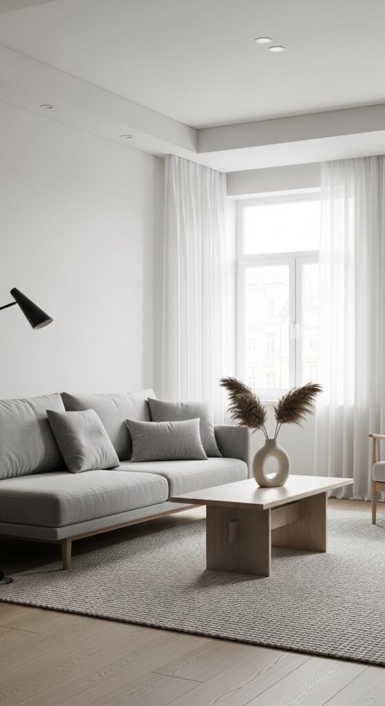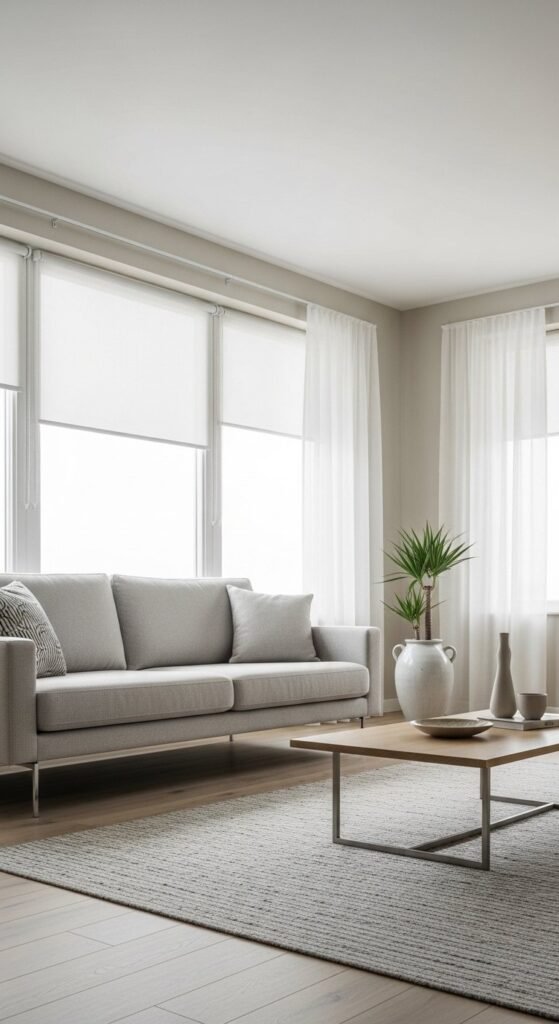 Minimal window treatments keep focus on light. Combine sheer curtains with concealed blinds for privacy. This keeps the window area clean during the day.