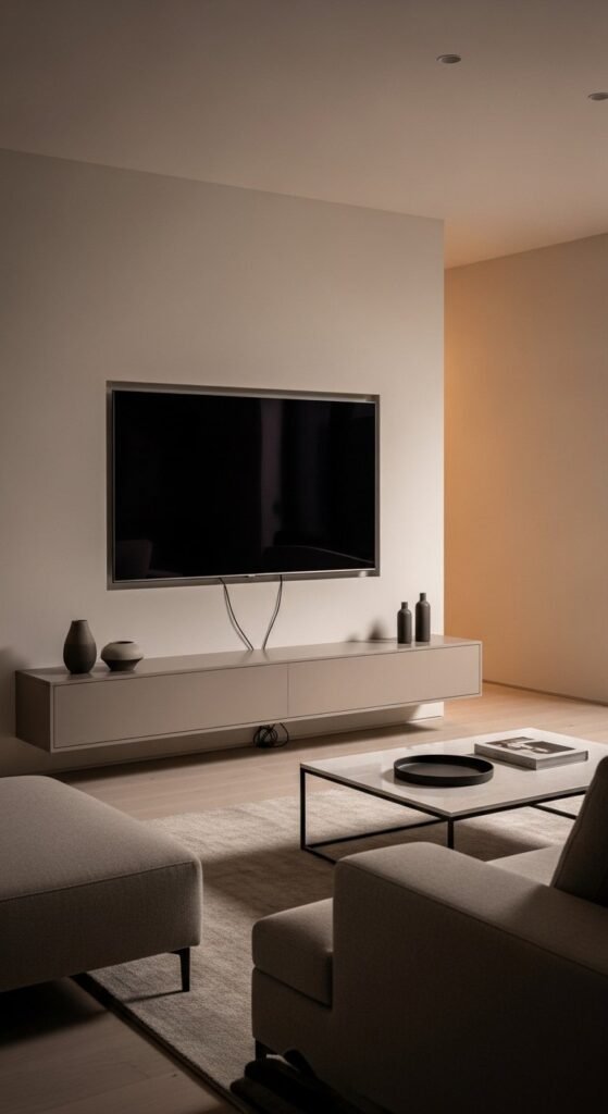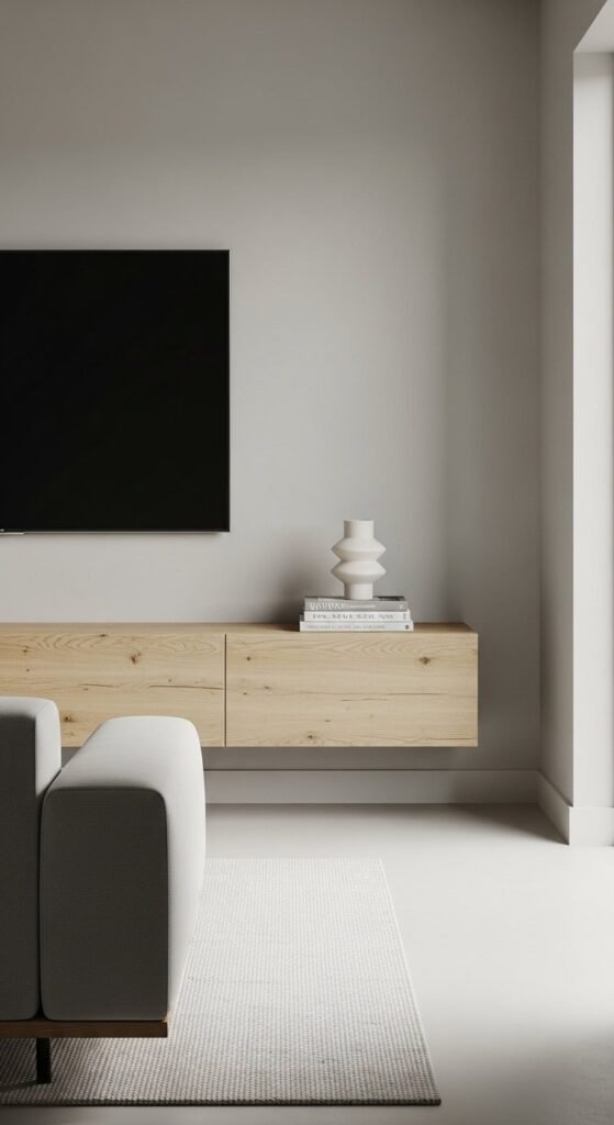 Cable management matters here. Hide wires behind the wall or inside the unit. This keeps the look quiet. If wall mounting isn’t possible, use slim legs to mimic the floating effect. Limit what sits on top. A single ceramic object or small plant is enough.
