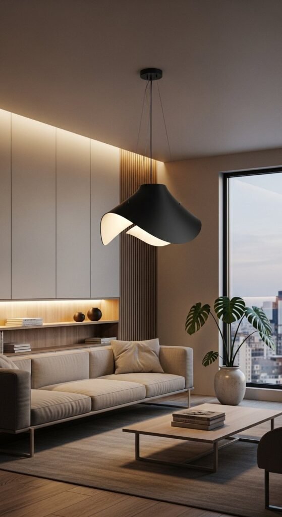 Let the light act as the focal point. Avoid competing decor nearby. Keep shelves and walls around it clear. For small rooms, a slim floor lamp beside the sofa works better than a large pendant. Warm bulbs are key. Cool lighting can make the space feel flat.