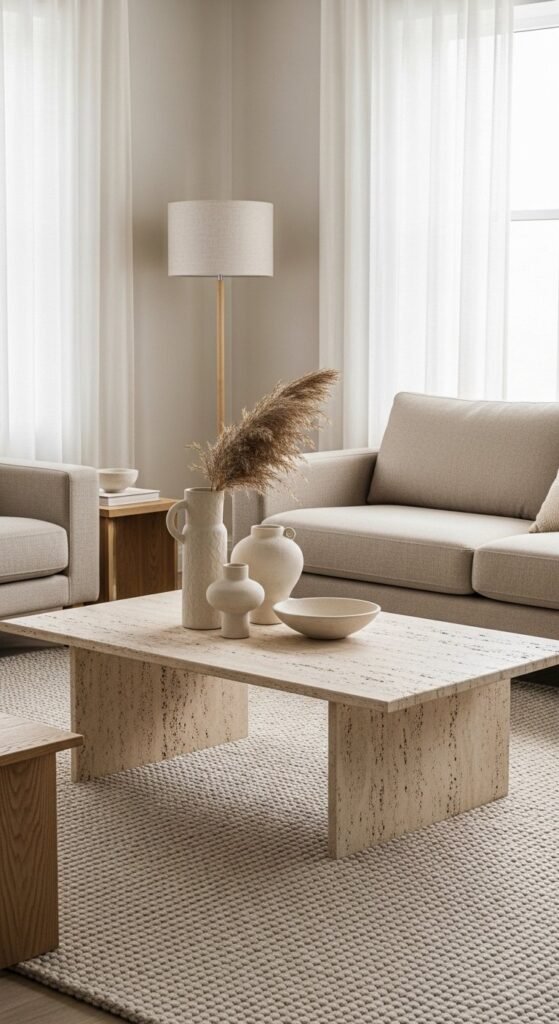 4. Travertine or Stone Coffee Table Centerpiece