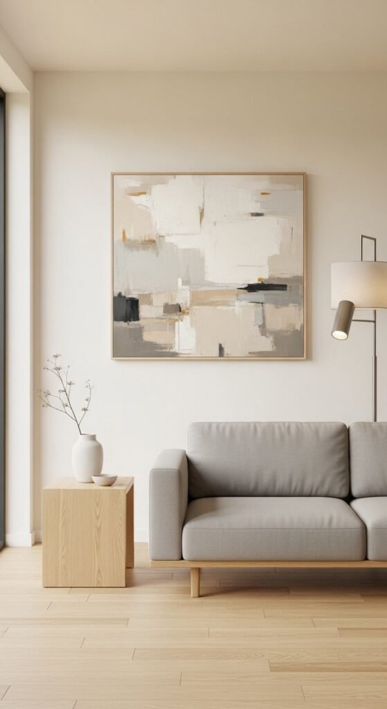 Minimalist wall art works best when it is intentional. One large piece has more impact than several small ones. Abstract art in muted tones fits well with modern interiors. Look for simple shapes or soft movement rather than bold colour.