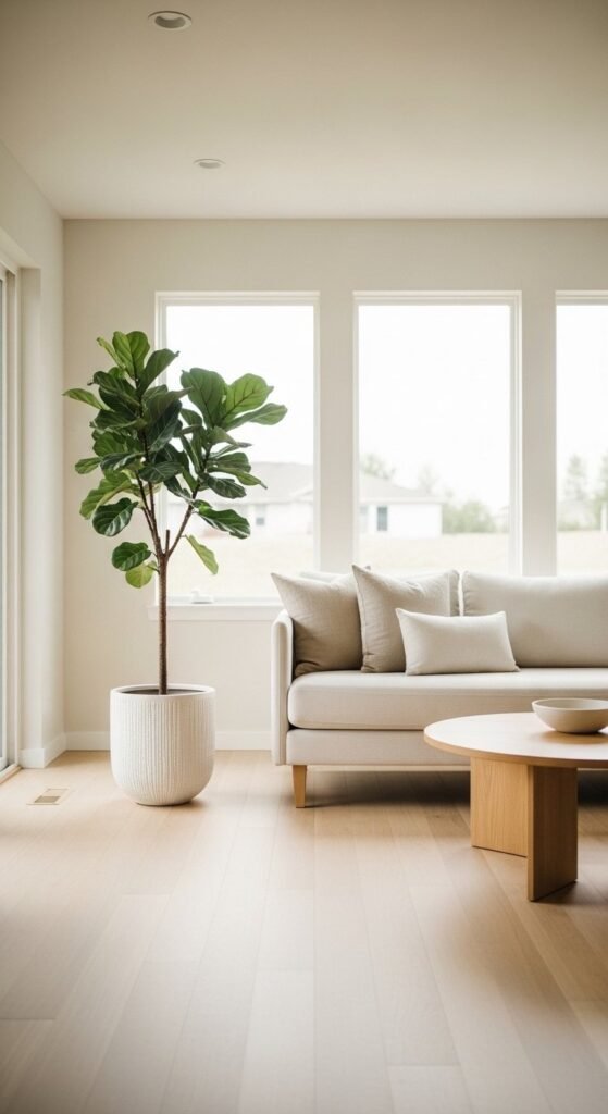 Plants soften clean lines and add life to minimalist rooms. Choose one or two larger plants rather than many small ones. Fiddle leaf figs, olive trees, or rubber plants work well. Use simple ceramic or stone planters in neutral shades.