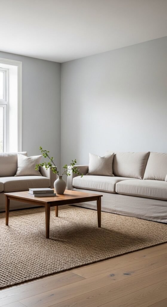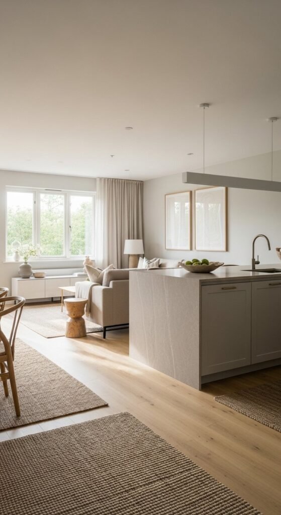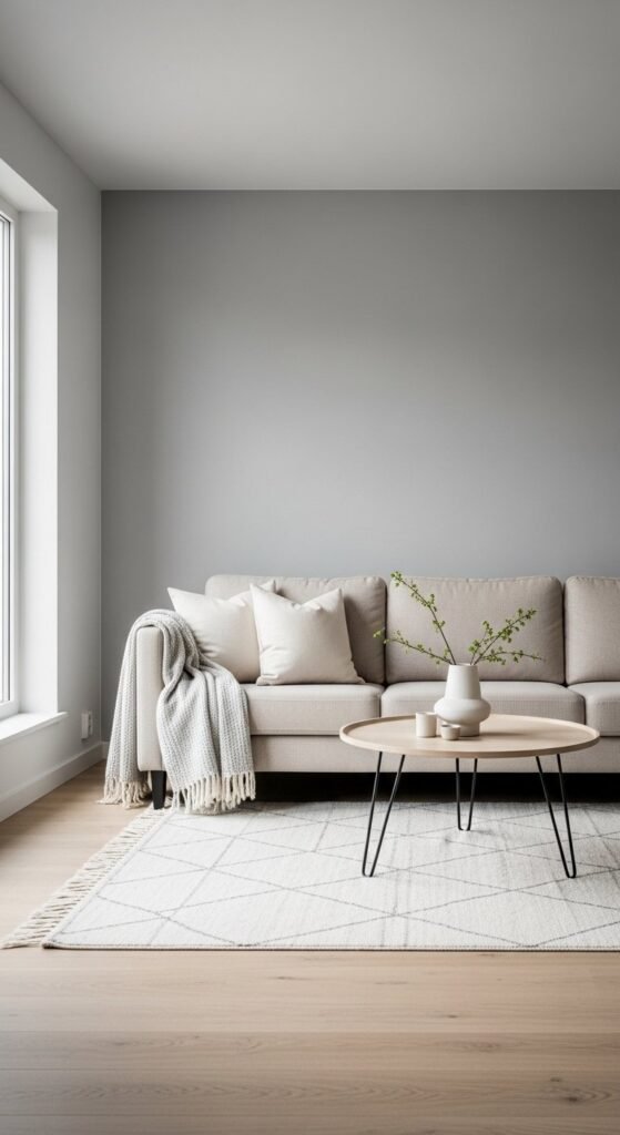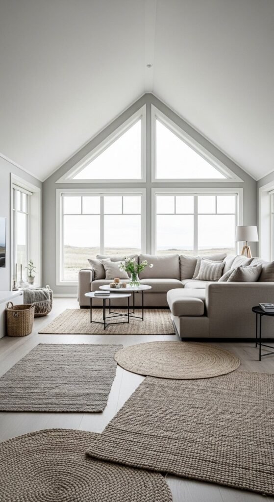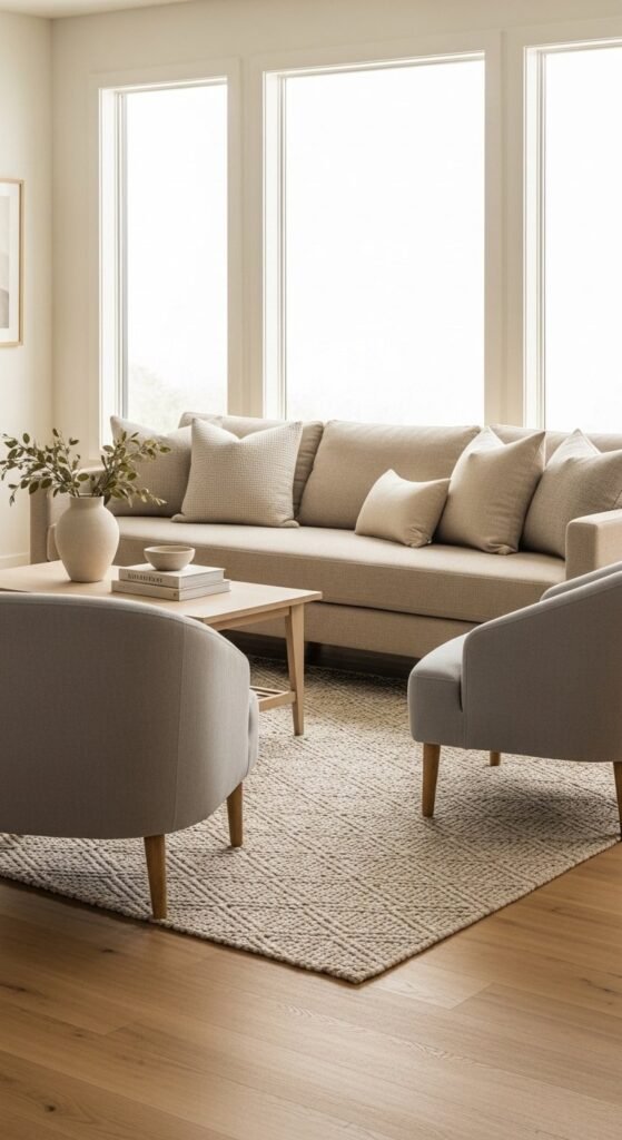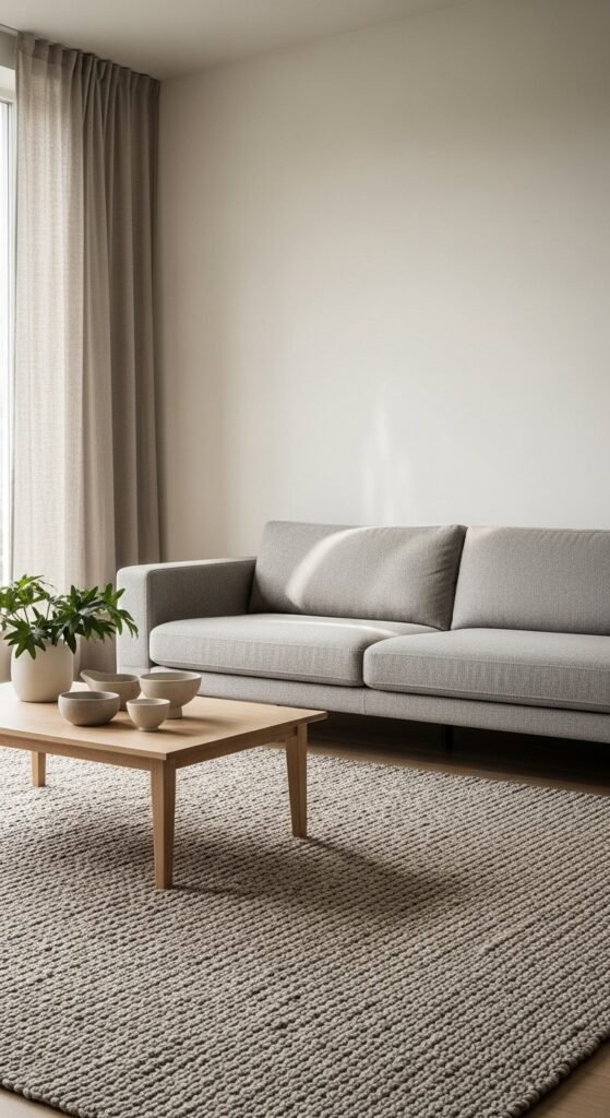 Woven rugs soften hard flooring and add depth to neutral living rooms. Layering smaller rugs over a base rug creates interest without introducing strong colors. Jute, cotton, or low pile textures work well. Budget friendly option: thrift secondhand rugs or mix sizes for an eclectic touch. Keep furniture neutral and low profile to let textures stand out. This layering trick feels intentional and cozy.