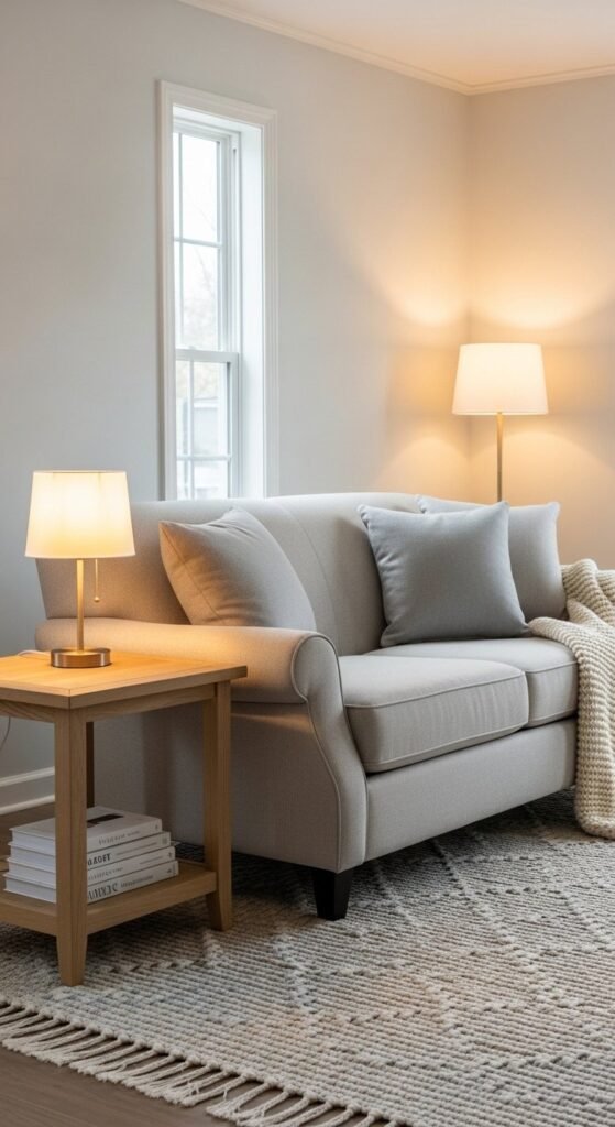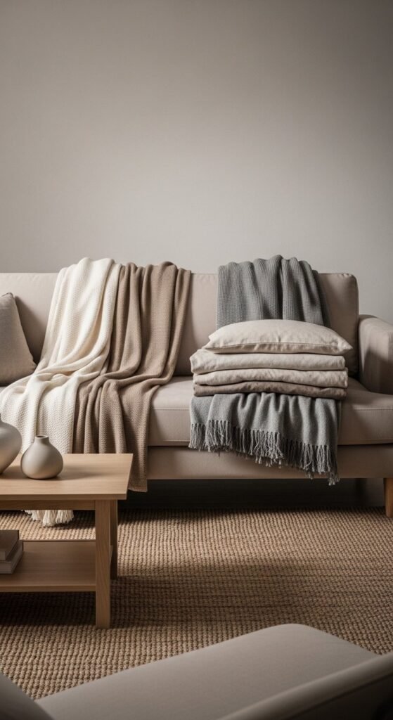 Layered throws instantly make a neutral room feel lived in. Mix textures like wool, linen, and knit for visual depth. Odd numbers of throws look intentional—drape one over the arm, another folded on the back. Budget tip: rotate existing blankets seasonally instead of buying new ones. Layering keeps the space cozy while maintaining a modern, understated vibe.