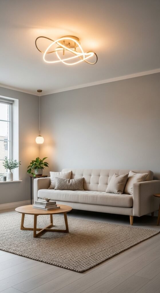 A sculptural ceiling fixture creates focus in a neutral room. Keep finishes simple—matte black, brushed brass, or plaster tones work best. Budget option: swap an existing shade for a bold design. Let the rest of the room stay calm, with subtle textures in rugs and throws. Lighting draws the eye upward, giving the room a sense of height and intentional style.