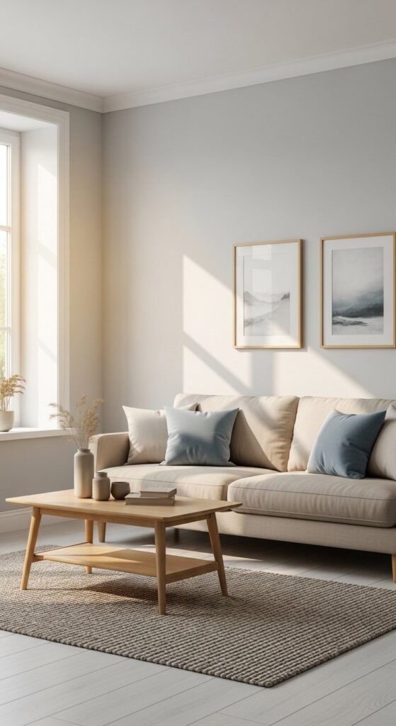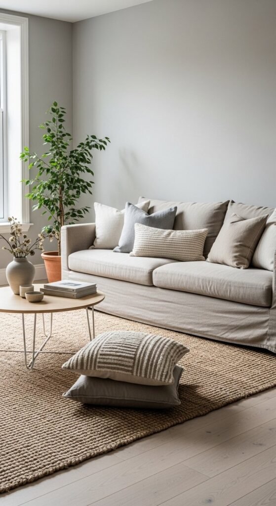Cushions are an easy way to add texture and depth to a neutral living room. Mix cream and gray fabrics in varying textures—linen, cotton, or boucle—to create visual interest. Odd numbers of cushions feel more natural. Budget trick: rotate existing cushion covers seasonally or make your own covers. Avoid adding too many colors; let texture do the heavy lifting. This simple touch instantly feels curated.