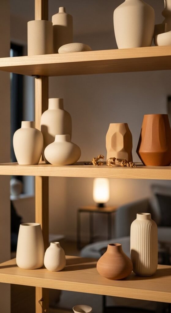 Ceramics bring natural texture and tactile interest to neutral rooms. Group in odd numbers for visual appeal. Use soft browns and beiges to maintain harmony with the sofa and walls. Budget friendly tip: check thrift stores or DIY simple painted ceramics. Keep the shapes simple and the arrangement uncluttered. Texture and shape create warmth without adding color, keeping the space calm and cohesive.