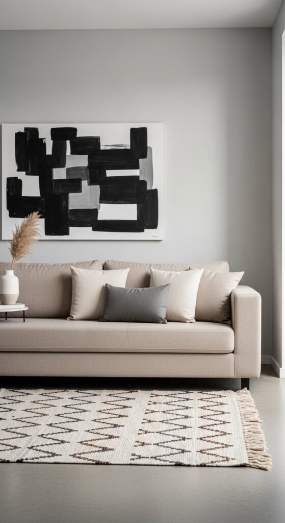 Abstract art adds edge and sophistication without strong color. Scale matters more than quantity. One large piece often has more impact than several small prints. Budget friendly option: digital prints or DIY abstract canvases. Keep furniture and textiles neutral to allow the artwork to stand out. This creates visual interest while staying true to a calm, modern palette.