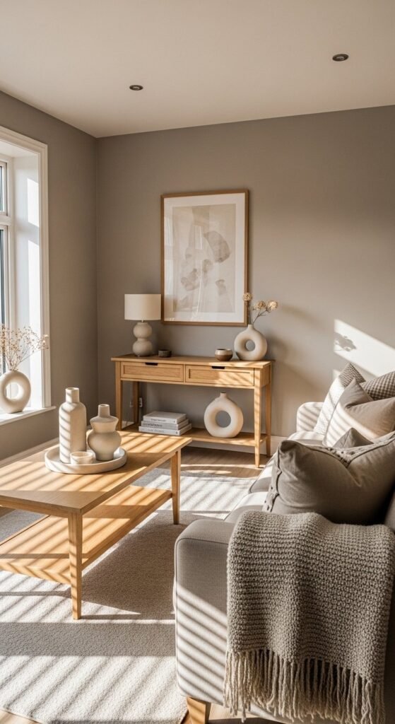 Greige walls sit comfortably between warm and cool tones, making them easy to live with year round. They pair especially well with light wood finishes like oak or ash. Consistency matters more than contrast. Keep wood tones similar across furniture to avoid visual clutter. DIY tip: paint large sample boards and move them around the room throughout the day. Use matte paint to soften light reflection. Style with simple ceramics and one plant to keep the space grounded.