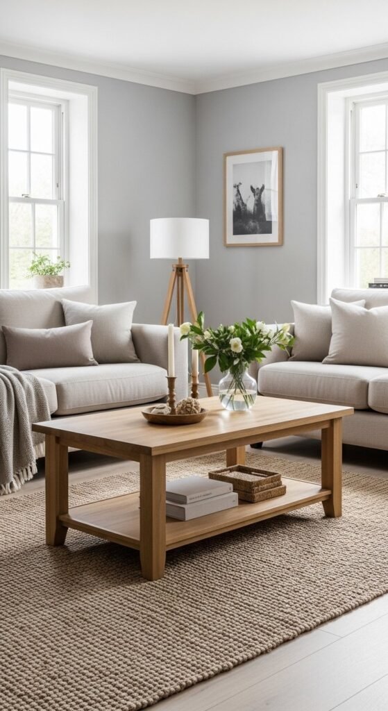 A light oak coffee table grounds neutral seating without dominating the room. Clean lines maintain a modern feel. Choose a low profile or rectangular shape to allow movement and flow. Budget friendly: thrift or upcycle a wooden table with light sanding and natural oil. Keep tabletop styling minimal—one vase, one book—for a curated, relaxed look.