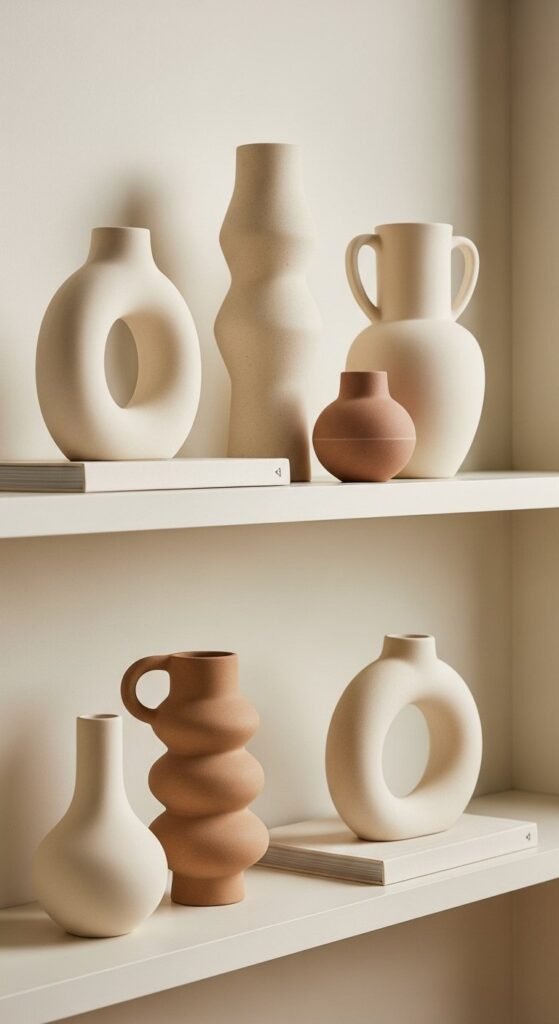 Sculptural objects add artful detail to a neutral room. Vary heights and shapes to create interest. Use soft neutrals to maintain cohesion with sofas and walls. Budget tip: create your own shapes using clay or recycled materials. Keep the arrangement simple, allowing each piece to breathe. These details subtly elevate a room’s texture without adding color.