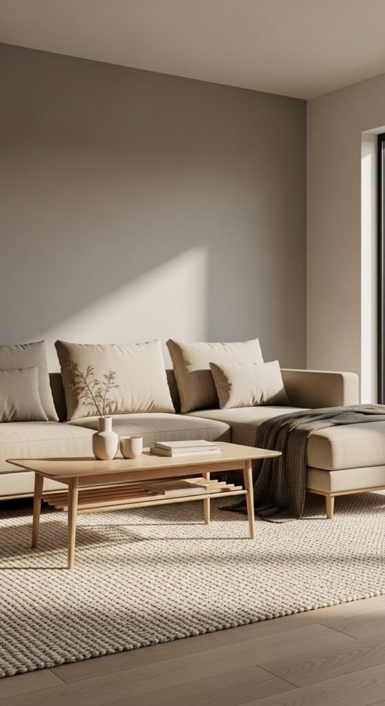Beige and gray work best when they feel intentional, not accidental. Start with one dominant tone, then layer the other through seating or cushions. Texture replaces color here. Linen, boucle, and tightly woven fabrics prevent the room from looking flat. Keep patterns subtle and stick to solids with visible weave. For a budget friendly update, rotate cushion covers instead of replacing furniture. Anchor the setup with a low profile rug that sits under the front legs of seating. Avoid shiny finishes. Matte fabrics and wood surfaces keep the look relaxed and modern.