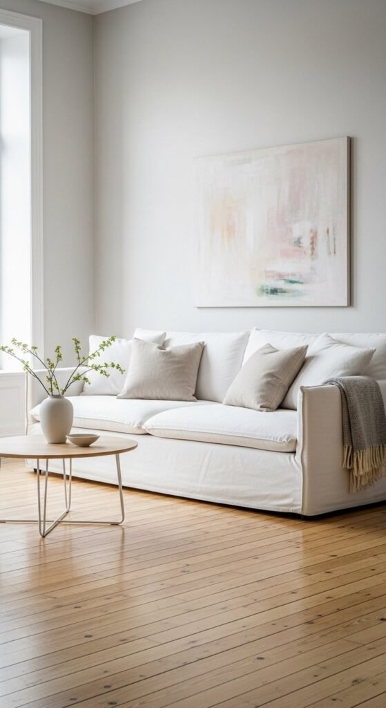 White slipcovers feel modern when the sofa shape stays structured. Straight arms and low backs keep the look current. Washable covers make this choice practical. Add depth through cushions in cream, taupe, or light gray rather than strong contrast. For budget setups, focus on silhouette first, then upgrade covers later. Pair with a textured rug and simple wood table. Skip heavy styling to keep the room feeling easy and lived in.