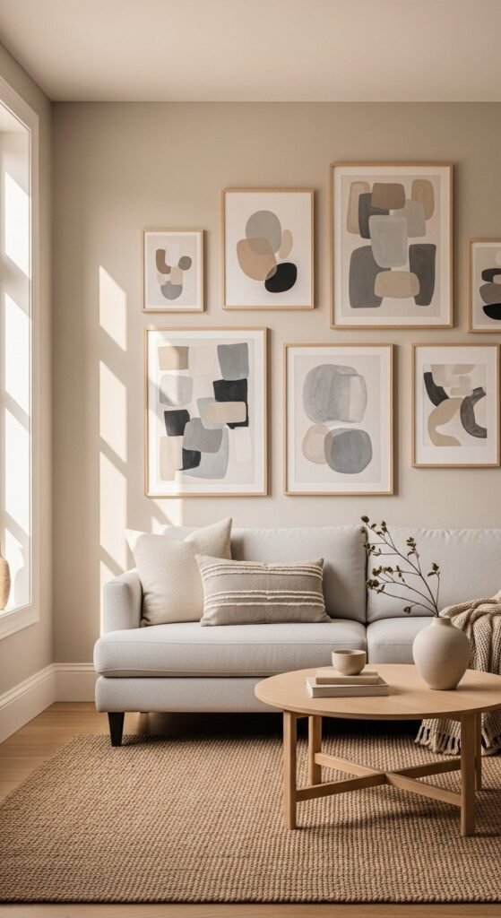 A gallery wall adds personality to neutral spaces without introducing bold color. Stick to muted tones and similar frames to keep it cohesive. Frame consistency matters. DIY tip: lay artworks on the floor first to plan spacing. Budget friendly option: print digital artwork or create small abstract pieces yourself. Keep surrounding decor minimal so the wall remains the focal point.