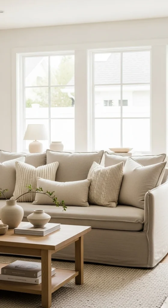 Steam instead of ironing. The light wrinkling looks intentional. Layer in pillows with subtle stripes or tiny stitched details to avoid a flat look. Keep everything in a tight palette so the sofa reads soft, not busy.