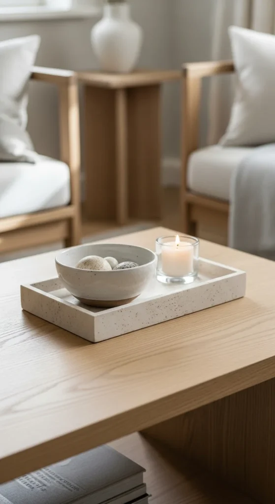 Stone trays organize visually. They corral small items and add weight.