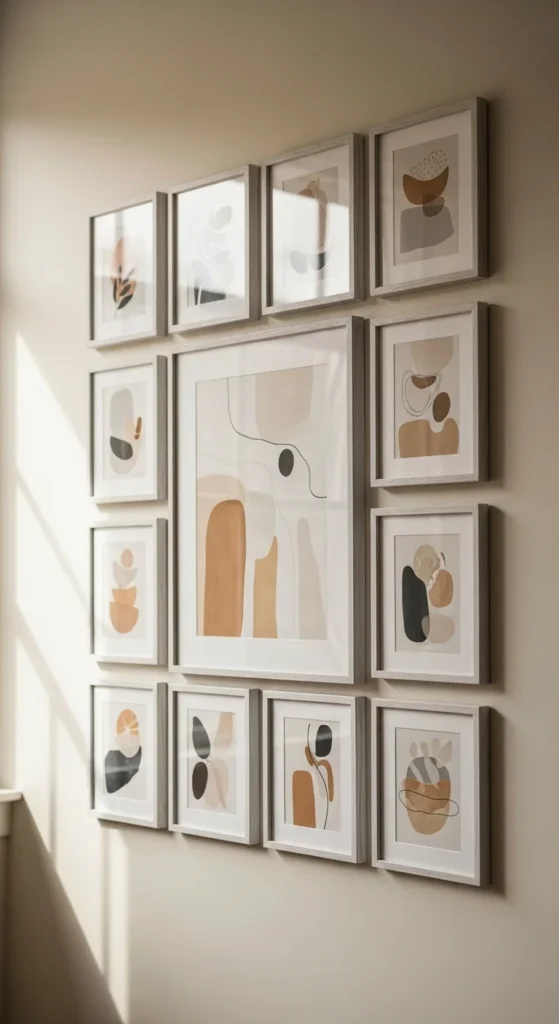 Hang in pairs or small grids for structure. One oversized piece works too. Keep spacing consistent.