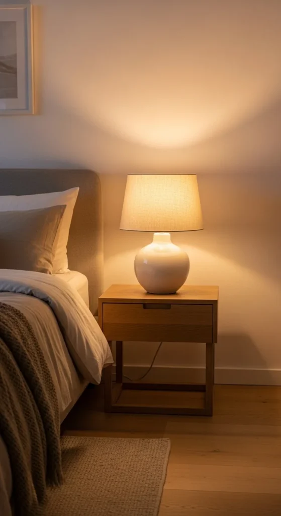 Stick to warm bulbs around 2700K. Cooler bulbs fight against neutral decor. Place lamps in pairs when possible. Bedsides. Console tables. Sofas. Symmetry brings visual rest.