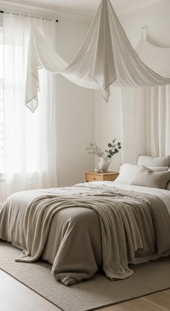 Stick to white, ivory, or pale flax. Avoid strong undertones. Let bedding stay simple so the canopy becomes the feature.