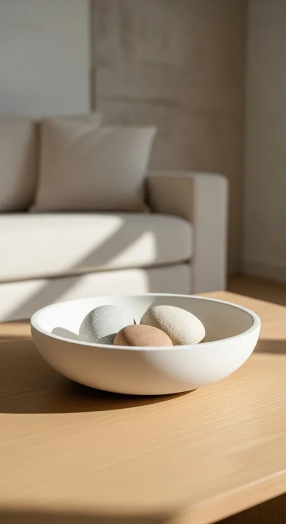 Lighting shapes the whole mood of a room. Ceramic lamps in creamy whites offer gentle presence without pulling attention. Look for rounded silhouettes or subtle ribbing. Avoid shiny finishes. Matte surfaces read calmer.